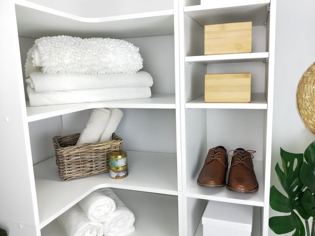 Make the most of your space with stylish corner shelving unit and shoe tower